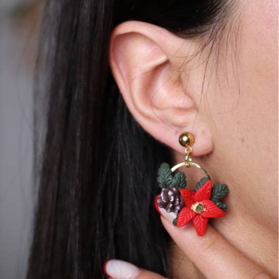 Tasarım Polimer Kil Poinsettia Kozalak Detay Gold Halkalı Noel Yeni Yıl Kadın Küpe