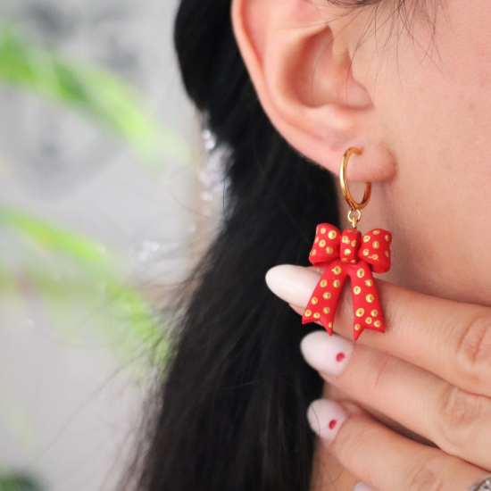 Polimer Kil Kırmızı Gold Detay Puantiyeli Fiyonk Küpe